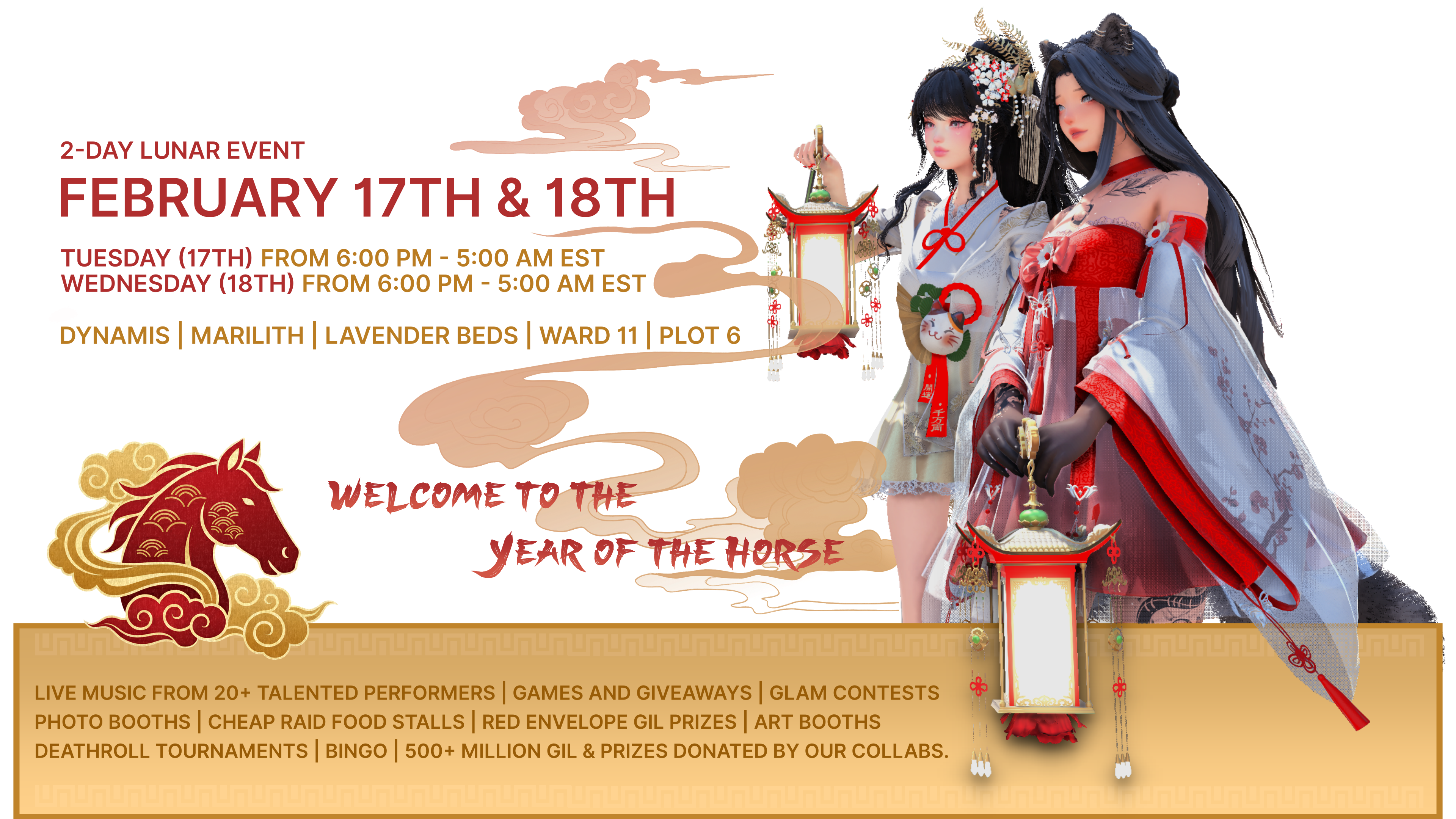 RULES:TUESDAY, February 17th: Obtain a red envelope adorn with red flowers uniquely crafted by one of our staff.WEDNESDAY, February 18th: Return on Wednesday to cash in your red envelope. You can then spin a wheel.PRIZES: Minion, Gil (50,000), Mount, Grand Gil Prize (10,000,000)